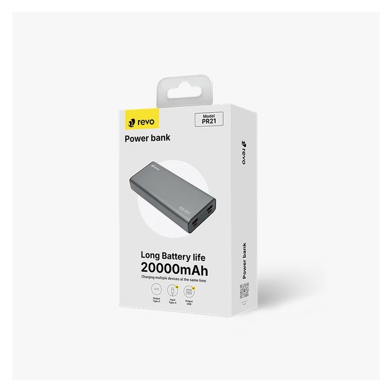 Power Bank 20 000 mAh en alliage d’aluminium + PC, design gris élégant, grande autonomie et format compact pour une recharge fiable partout.